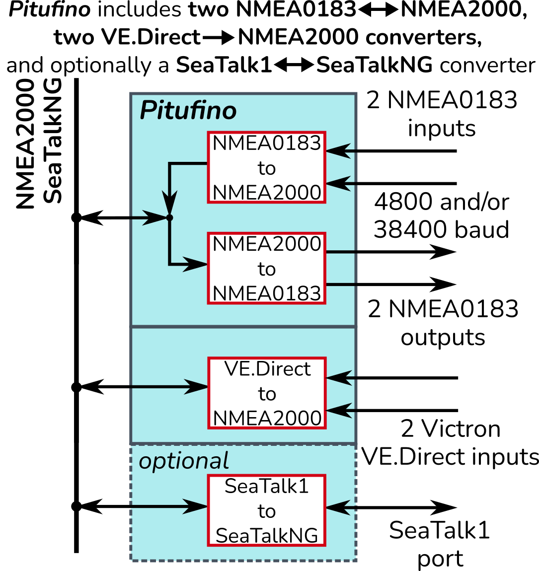 optional isolated SeaTalk1 port (with Seatalk module or Pitufino ST)