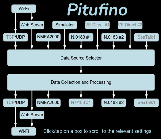 Pitufino's data routing uses a single Data Source Selector for all inputs (wired and wireless) and protocols: